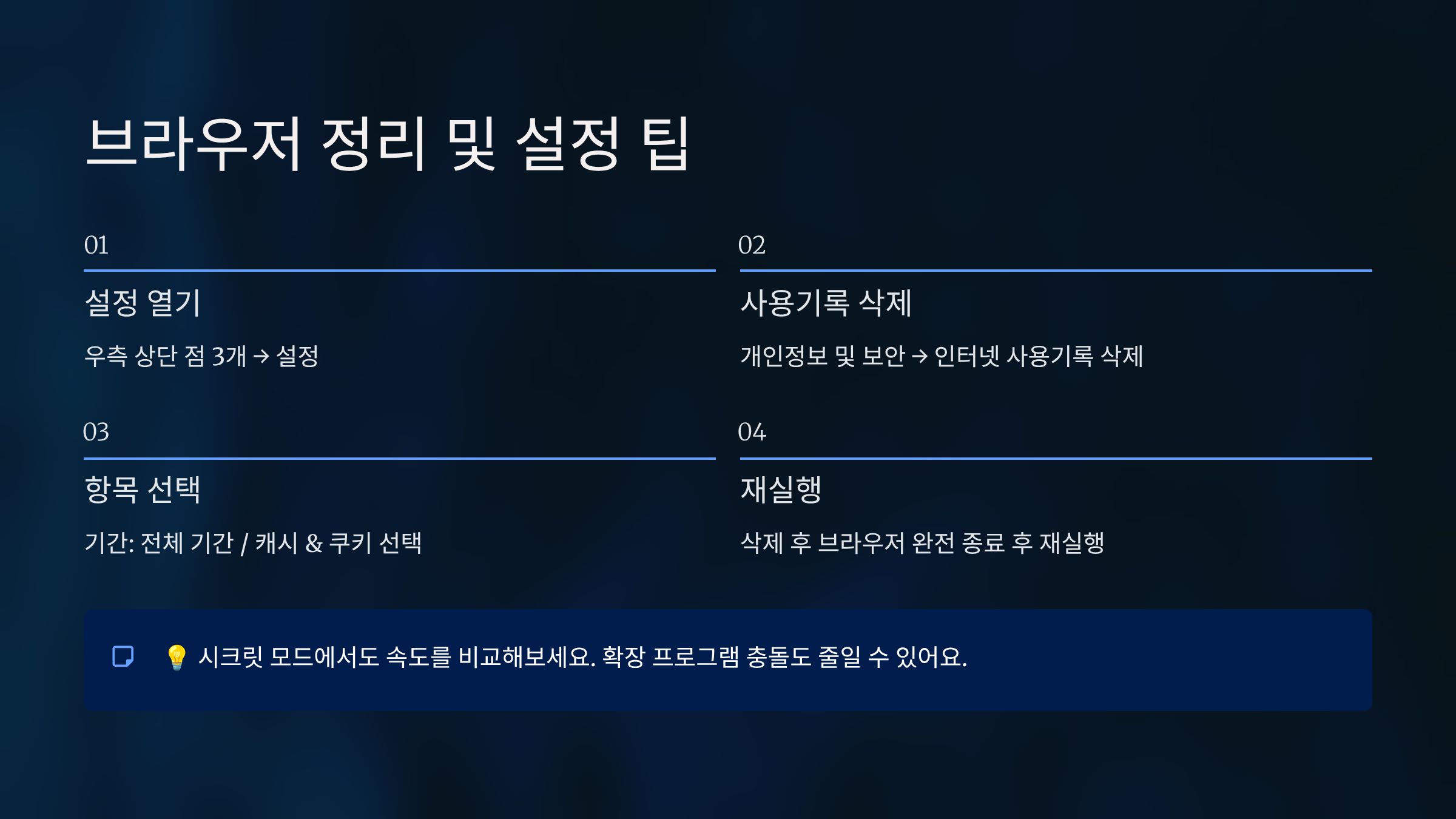 시크릿 모드에서도 속도를 비교해보세요. 확장 프로그램 충돌도 줄일 수 있어요.