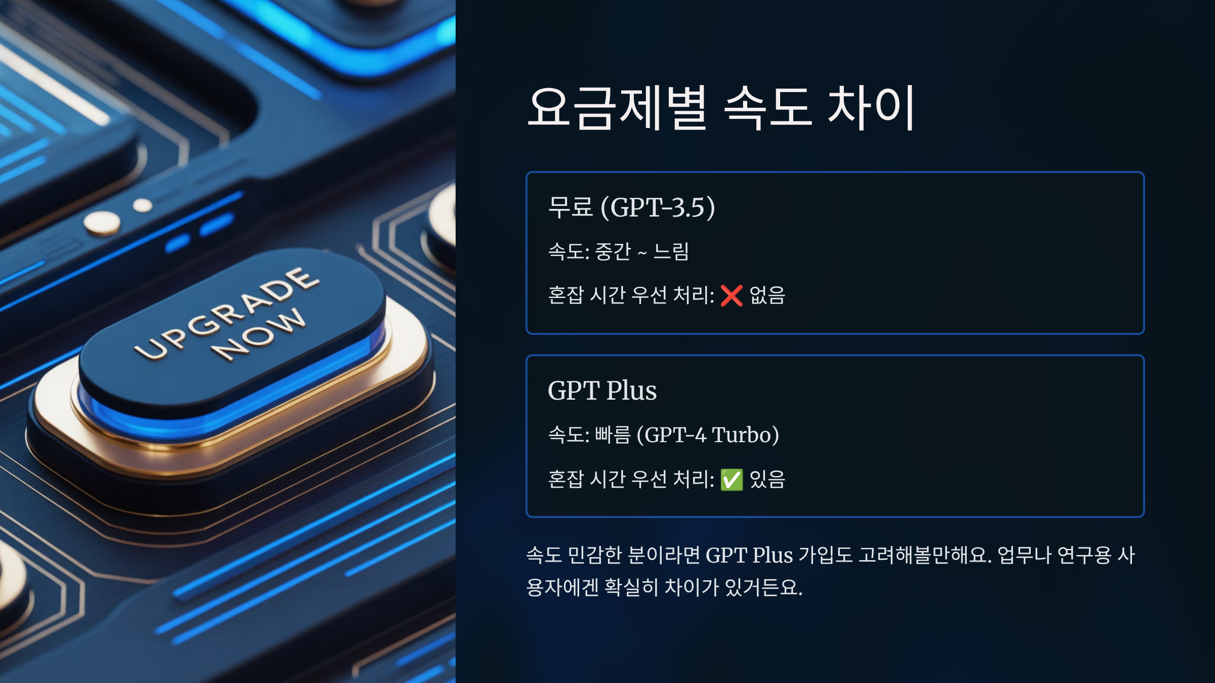 많은 분들이 궁금해하는 부분이에요. 무료 플랜과 유료 플랜(GPT Plus)은 확실히 속도 차이가 나요. 특히 GPT-4 Turbo는 더 빠른 응답과 우선 처리 혜택이 있어요.