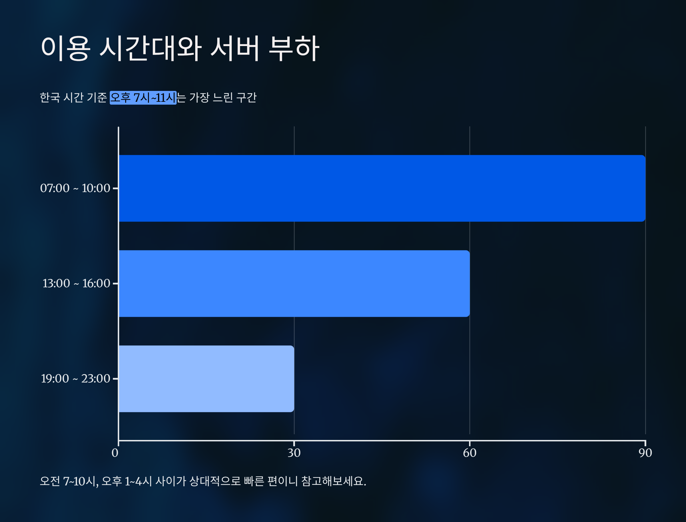 이 시간대는 미국과 유럽의 업무 시간과 겹치면서 서버가 가장 붐비는 시간이라 응답 속도가 저하될 수 있어요.