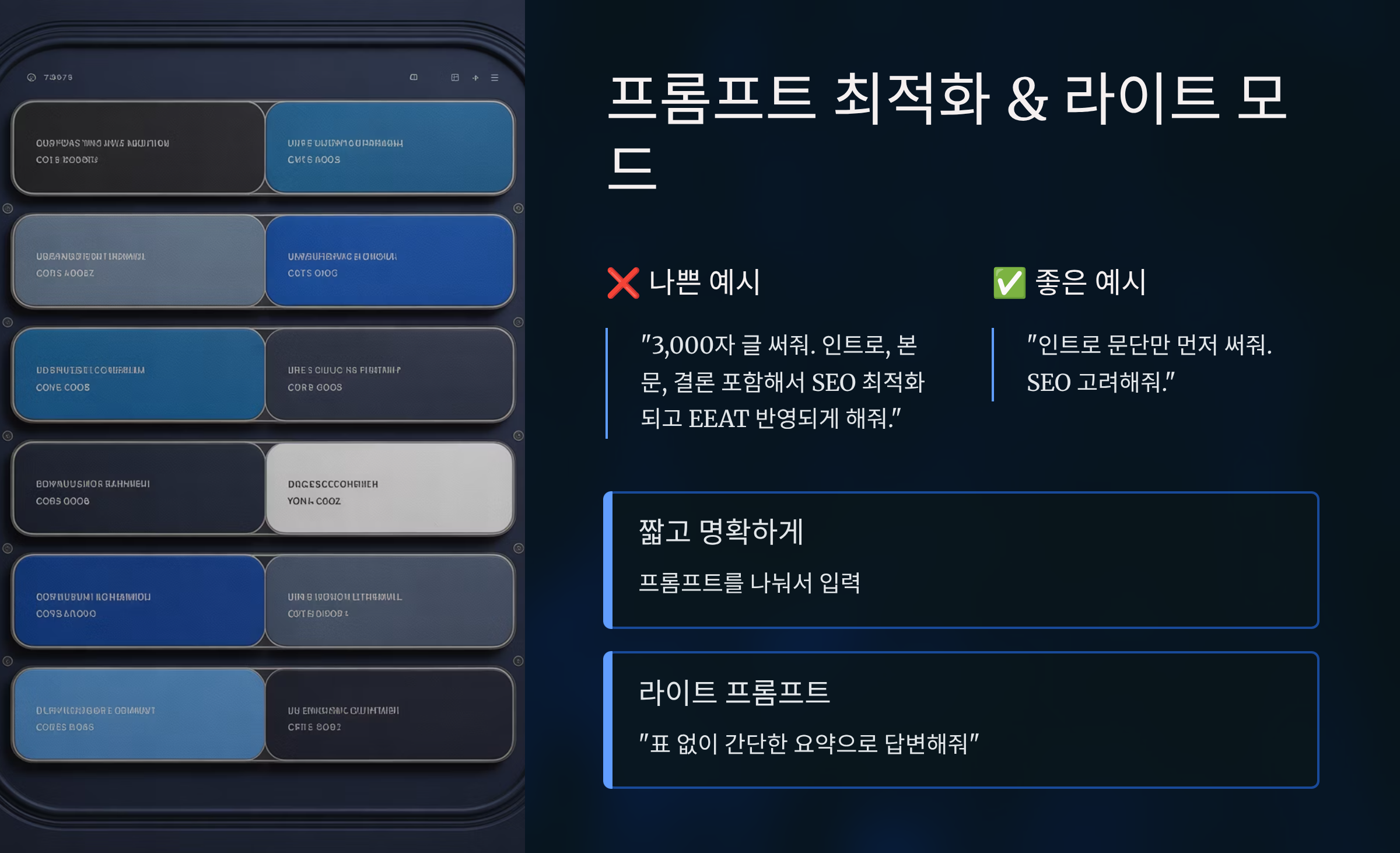 - ❌ “3,000자 글 써줘. 인트로, 본문, 결론 포함해서 SEO 최적화되고 EEAT 반영되게 해줘.”
