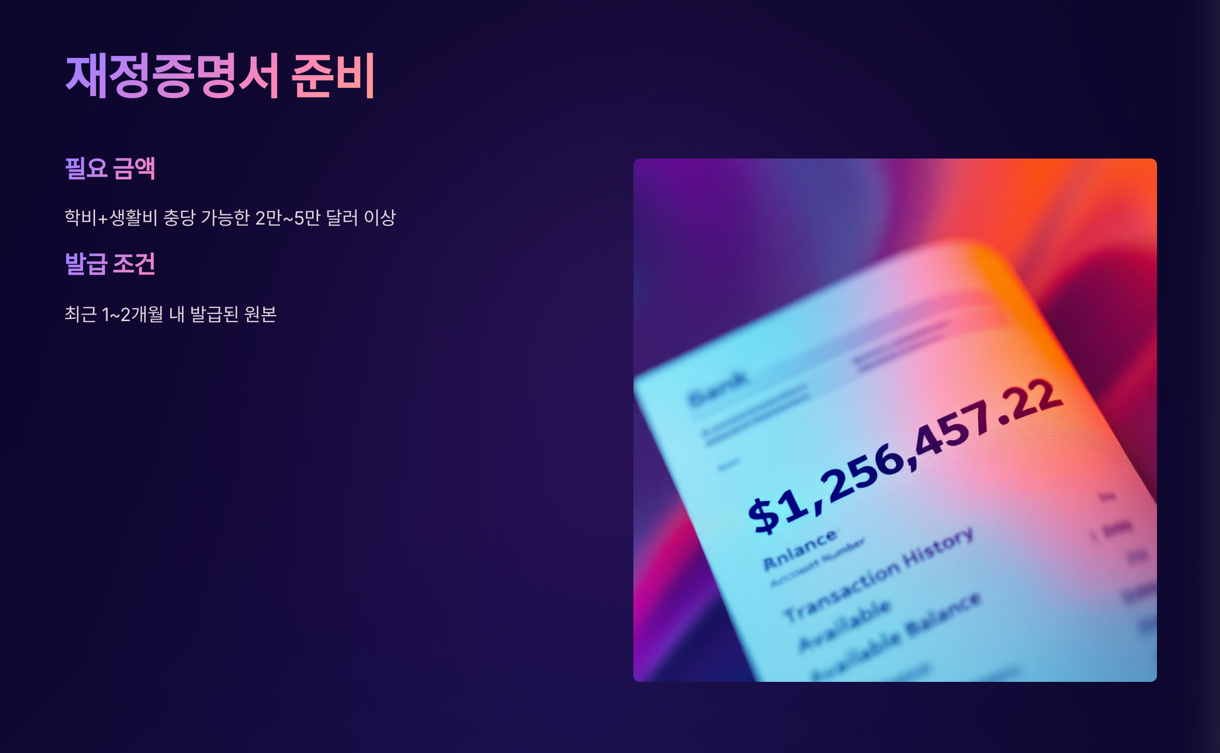 ① 재정증명서: 미국 유학비자는 ‘재정 능력’이 매우 중요한 기준이에요. 학교에서 제시한 연간 학비 + 생활비 총액을 충당할 수 있는 금액이 명시돼야 하며, 일반적으로 2만~5만 달러 이상이 필요해요. 부모 또는 후원자 명의일 경우, 가족관계증명서나 후원 동의서를 함께 제출해야 해요.