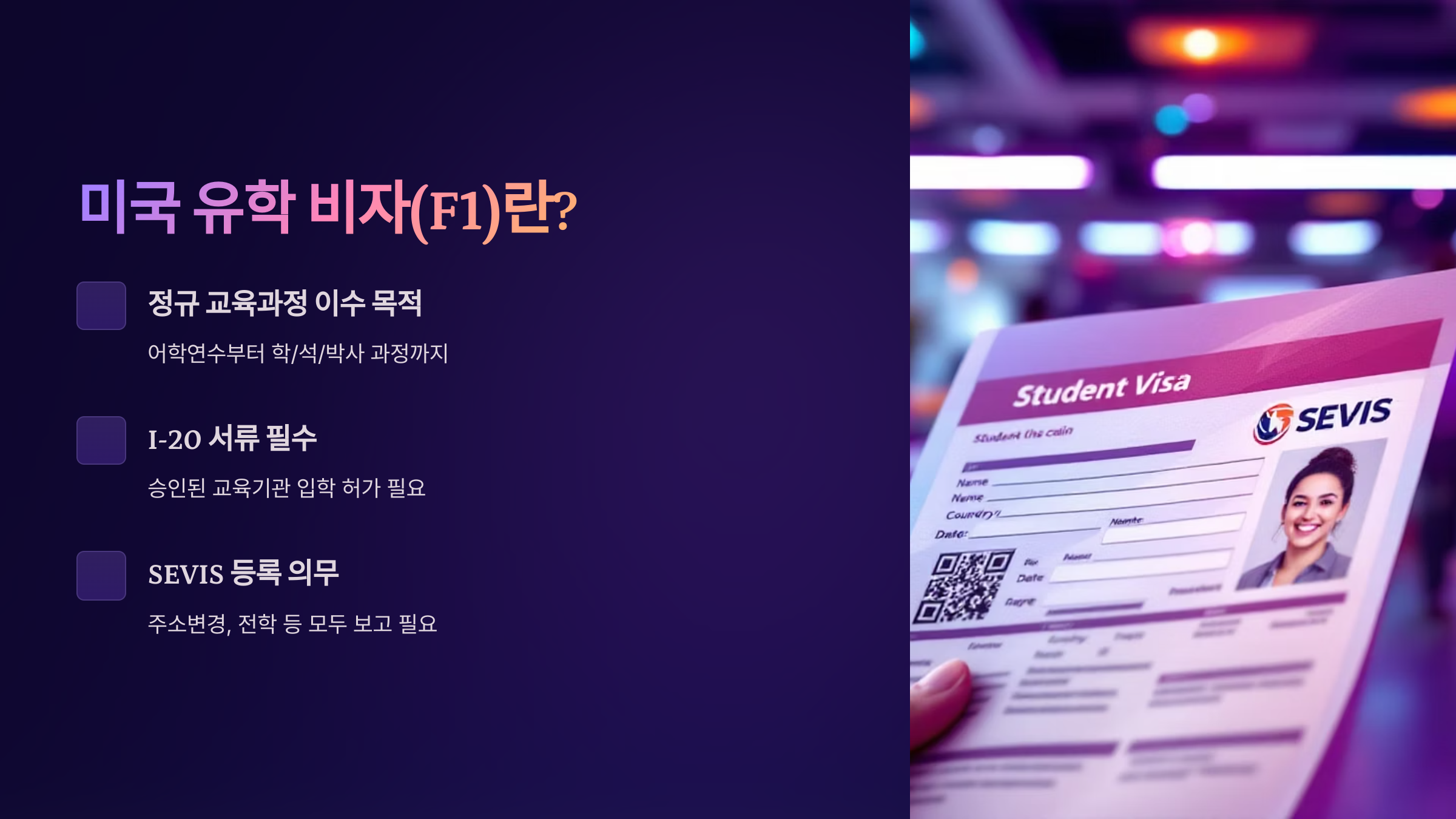 F1 비자는 미국에서 정규 교육과정을 이수하고자 하는 외국 학생들에게 발급되는 대표적인 유학 비자예요. 어학연수부터 학사, 석사, 박사 과정까지 모두 해당되며, 학생 신분으로 미국에 장기 체류할 수 있는 법적 자격을 부여해주는 비자랍니다. 🎓